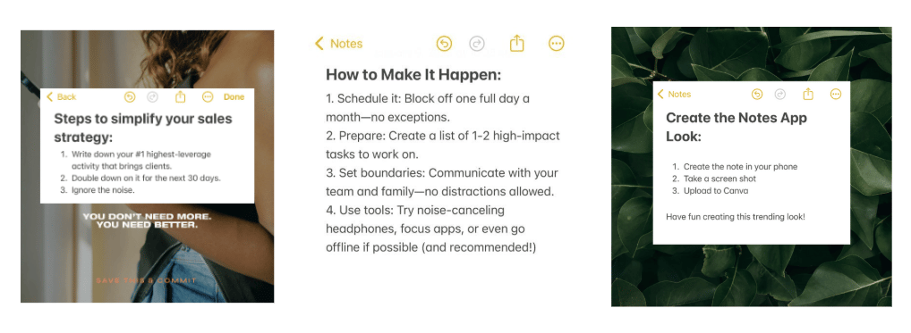 Hey, Reader, Last week I shared 4 eye-catching design trends I pulled straight outta my growing inspo bank that I'm LOVING lately... ❤️Overlays Missed that email? Check it out here so you don't miss out on any inspo. Today we're sliding into part 2 of my 3-part series featuring some of my favorite eye-catching design trends that are not only fun to look at—but super easy to recreate in Canva. 🙌 But first—a quick truth bomb 💣 While trends keep your designs fresh and appealing, attract and engage your audience, and elevate your brand perception... They’re like sprinkles!🎂Fun to play with, not the main ingredient. Your brand should be built on your brand foundations, audience, and consistency—not what’s currently popular. Use these trends for inspiration, to refresh your social posts, spice up a promo graphic, or test out a new vibe without committing long-term... Unless you fall head over heels in love with them! Alright, let’s dive in 👇 🌫️ Trend #5: Italic CombinationsThis look is subtle but powerful... And super easy to pull off. Use a classic serif font and mix in the italic version to add sophistication and emphasis without overdoing it. (Pro design move. Major vibes.)👇 🎨 Trend #6: Arched Photo FramesArched frames are everywhere right now—and for good reason. They soften your layout, break up all the boxy content, and add a touch of elegance to even the simplest design. It’s giving "modern brand with taste." 📝 Trend #7: Notes App Look (+ how to do it)Yep, straight outta your iPhone! This trend is simple, super relatable, and great for sharing thoughts, reminders, or real talk with your audience in a way that feels human. My fave thing about this trend is that they are super quick to create! Note your ideas when they come and use your notes for content later. 🧾 Trend #8: Neon Pastel AccentsThis trend is everywhere - and I'm loving it cause you get the best of both worlds! Neon = bold and attention-grabbing, Pastels = soft and inviting. This little color trick adds energy and vibrancy to your graphics without overwhelming the design.👇 ❤️🔥HOT TIP: Don't go overboard with this one! A little neon pastel goes a lonnnng way. Here are some fun ideas for you to try: That’s your design inspo dose for the week, Reader!What do you think so far? Any of these already calling your name? Next week's email is the final one in this little series—and I saved some of the boldest trends (and my swipe file 👀) for last. I can't wait to see what you create! P.S. If you're already a member of The Brand Boss Design Club, you'll find all 12 design trend techniques with full tutorials, plus companion templates in the "Eye-Catching Design Trends + How to Re-create Them in Canva" lesson. Not a member yet? No stress! Learn more and see what all the hype is about here. |
